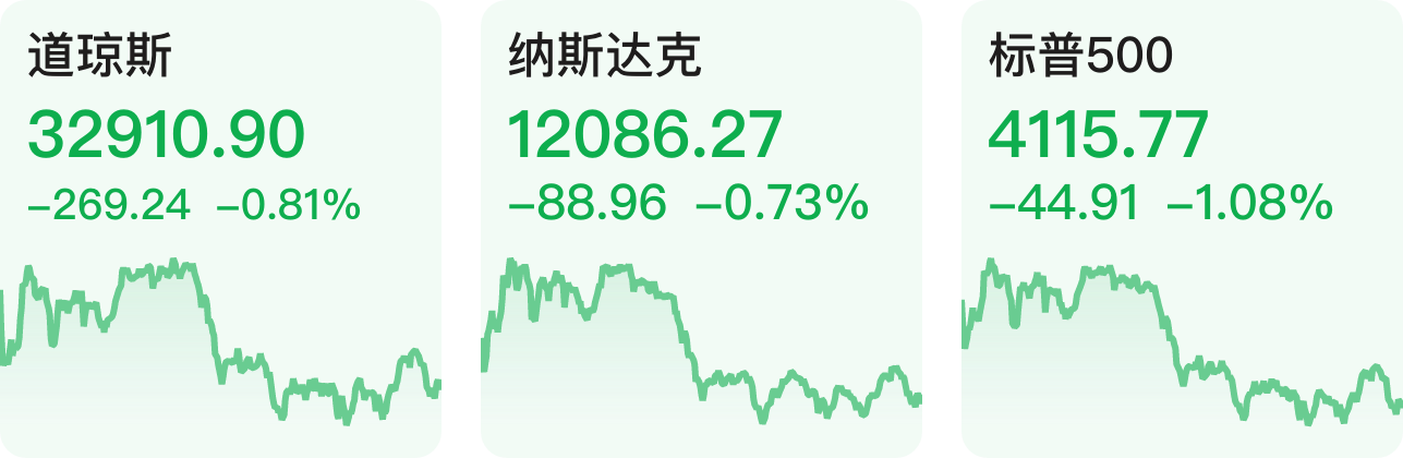 美股三大股指全线下跌,标普500指数跌1.08%,报4115.77点;道指跌0.81%,报32910.90点;纳指跌0.73%,报12086.27点。英特尔跌超5%领跌道指成分股。热门中概股延续近日强势表现,阿里巴巴涨超14%,拼多多涨超9%,京东涨超7%。趣头条涨超71%,有道涨30%。