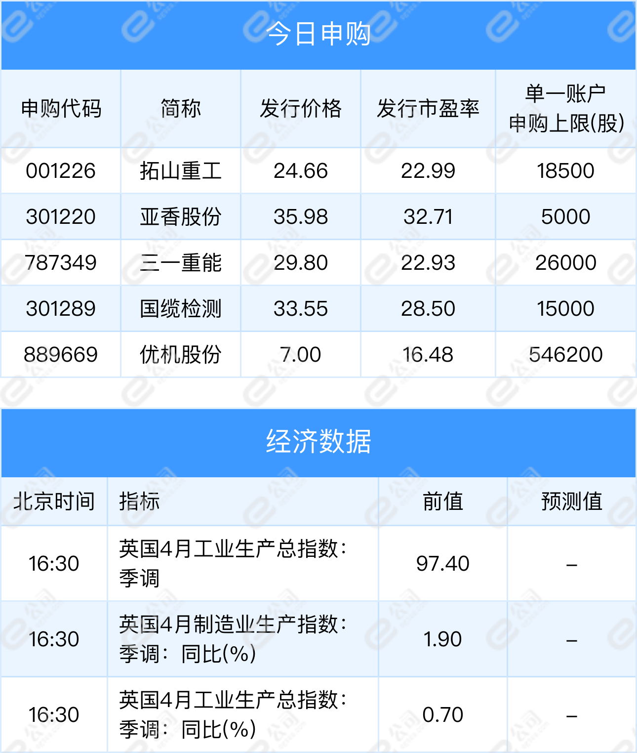 【摘要】今日可申购拓山重工、亚香股份、三一重能、国缆检测和优机股份;央行重磅数据出炉,5月信贷社融显著回升,M2增速创年内新高;农业农村部:进一步做好扩大农业农村有效投资工作;国办:加快推进城市燃气管道等老化更新改造;国家能源局:提高机组设备制造产能,满足当前及未来抽水蓄能大规模开工建设需要;5月A股新增投资者120.26万,环比下降4.3%;中汽协:5月新能源汽车销量44.7万辆,同比增长105.2%;95号汽油或进入10元时代,创历史新高;美国5月消费者价格指数涨幅创40年来新高。