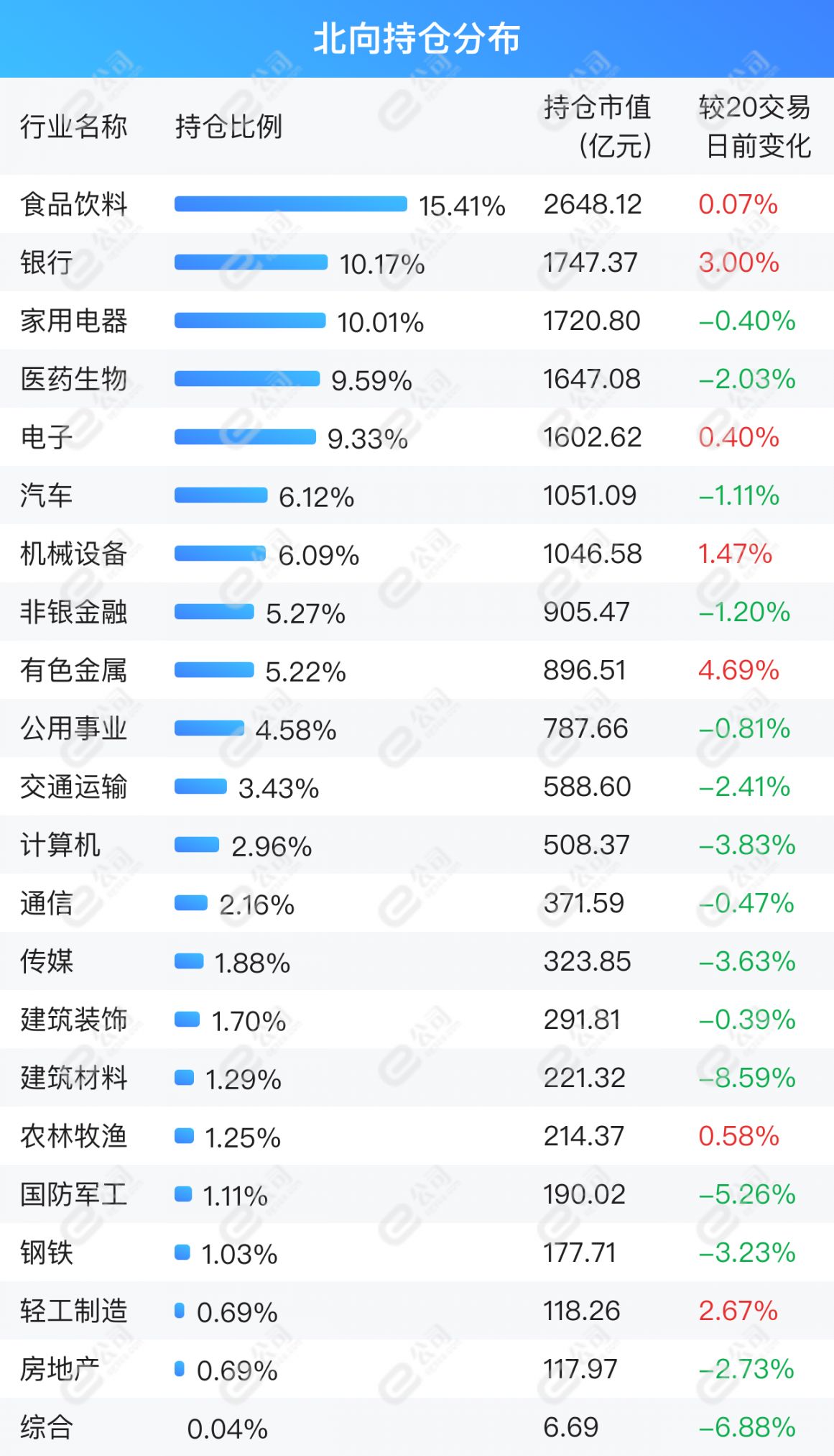 北向资金持仓市值前五行业为食品饮料、银行、家用电器、医药生物、电子,占持仓总市值54.5%。