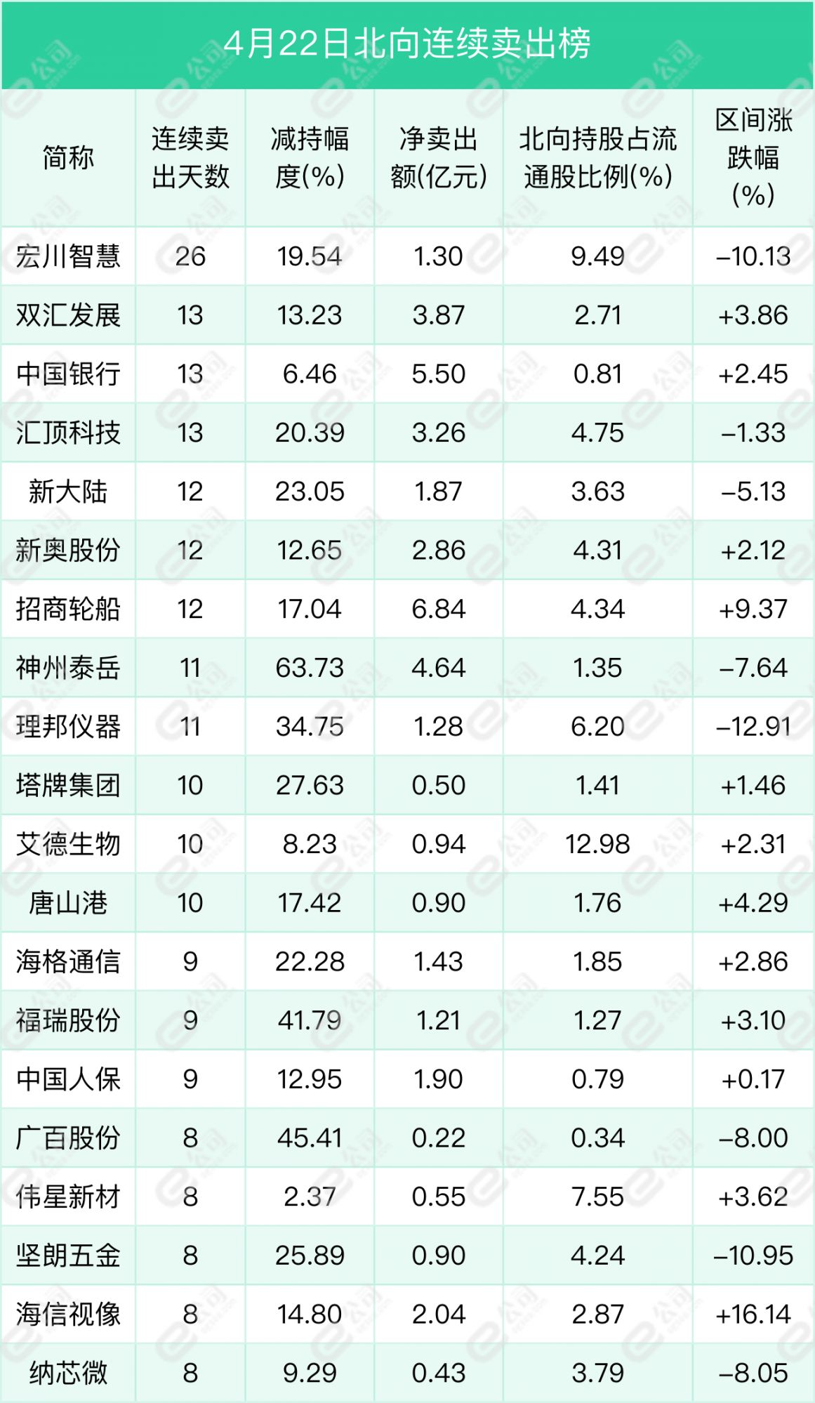 宏川智慧、双汇发展、中国银行遭北向资金连续净卖出天数居前,分别为26天、13天、13天,期间净卖出额分别为1.3亿元、3.87亿元、5.5亿元,期间减持幅度分别为19.54%、13.23%、6.46%。