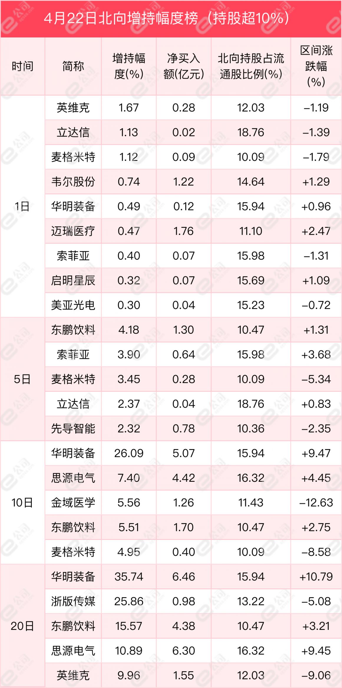 从增减持幅度来看,北向资金持股占流通股比例超10%的个股中,英维克、立达信、麦格米特获北向资金增持幅度居前,分别为1.67%、1.13%、1.12%。