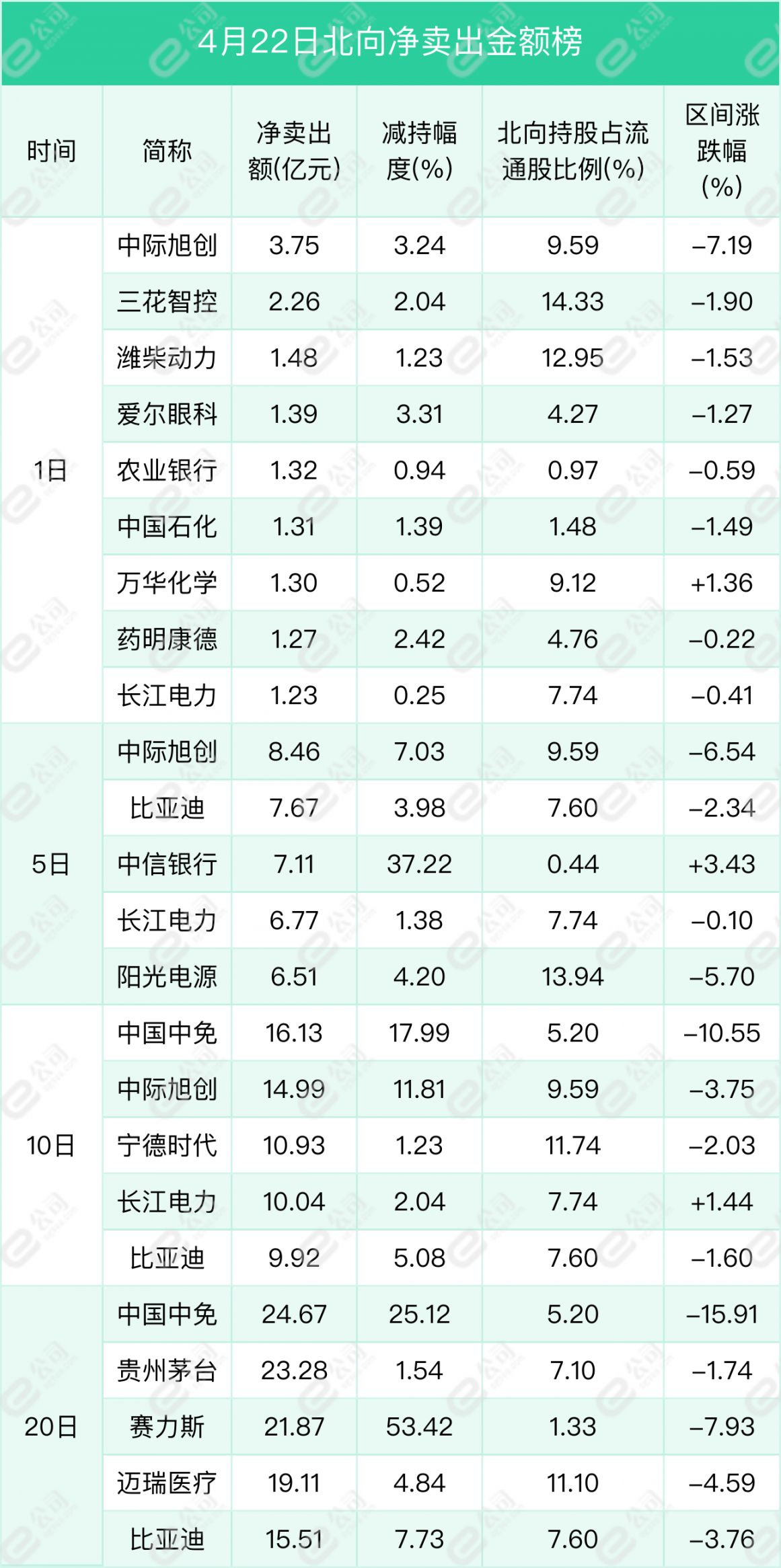 中际旭创、三花智控、潍柴动力遭北向资金净卖出金额居前,分别为3.75亿元、2.26亿元、1.48亿元,减持幅度分别为3.24%、2.04%、1.23%。