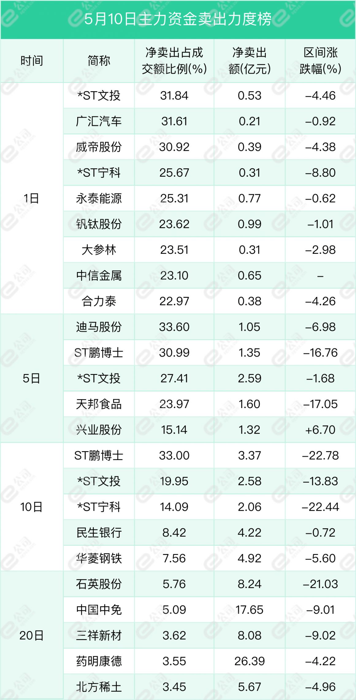 *ST文投、广汇汽车、威帝股份遭主力资金大力卖出,净卖出额占当日成交额比例分别为31.84%、31.61%、30.92%,净卖出额分别为0.53亿元、0.21亿元、0.39亿元。