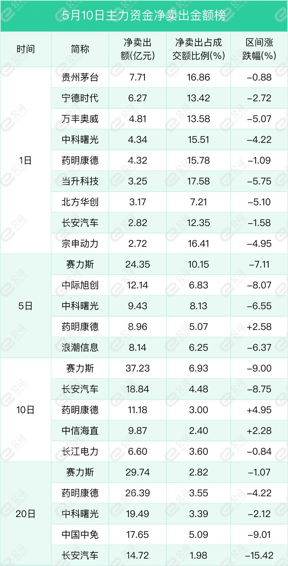 贵州茅台、宁德时代、万丰奥威获主力资金净卖出金额居前,分别为7.71亿元、6.27亿元、4.81亿元,占当日成交额16.86%、13.42%、13.58%。