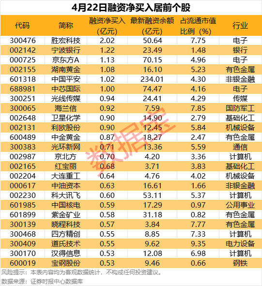 具体到个股,4月22日获融资净买入千万元以上的有281只,其中24只融资净买入额超5000万元。胜宏科技融资净买入额居首,当日净买入2.02亿元;其次是宁波银行、京东方A,融资净买入金额分别为1.22亿元、1.13亿元;融资净买入金额居前的还有湖南黄金、中国平安、中芯国际等。