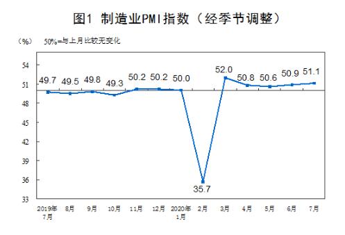 e公司讯,7月份,中国制造业采购经理指数(PMI)为51.1%,比上月上升0.2个百分点,连续5个月位于临界点以上。从企业规模看,大型企业PMI为52.0%,比上月微落0.1个百分点;中型企业PMI为51.2%,比上月上升1.0个百分点;小型企业PMI为48.6%,比上月下降0.3个百分点。从分类指数看,在构成制造业PMI的5个分类指数中,生产指数、新订单指数和供应商配送时间指数均高于临界点。