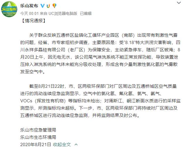 e公司讯,据乐山发布,乐山五通桥区盐磷化工循环产业园区(南部)出现带有刺激性气雾的问题,经初步调查,主要原因是:受“8·18”特大洪涝灾害影响,四川永祥多晶硅有限公司(老厂区)为保障安全,主动紧急停车,随后厂区被淹;8月20日上午,因无电无水,该公司尾气淋洗系统不能正常发挥功能,导致装置泄压排入淋洗系统的气体未能充分吸收处理,形成含有少量刺激性氯化氢的气雾散发至空气中。