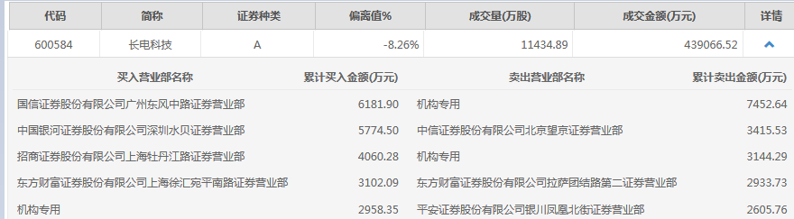e公司讯,长电科技(600584)9月2日低开低走,放量大跌8.43%,全天成交43.9亿元。龙虎榜数据显示,两个机构席位合计卖出1.06亿元,一个机构席位买入2958万元。买一席位国信证券广州东风中路买入6182万元。消息面上,大基金拟减持公司不超2%股份。