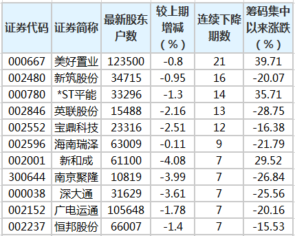 e公司讯,证券时报•数据宝统计显示,436家上市公司公布了截至12月31日最新股东户数,相比之前各期,有92股股东户数连续减少3期以上,股东户数最多已连降21期。股东户数连续下降个股中,连降时间较长的有美好置业、新筑股份等。其中,美好置业股东户数已连续减少21期,累计降幅为21.93%;新筑股份股东户数连降16期,累计降幅16.05%。股东户数连降期数较多的还有*ST平能、英联股份、宝鼎科技等。