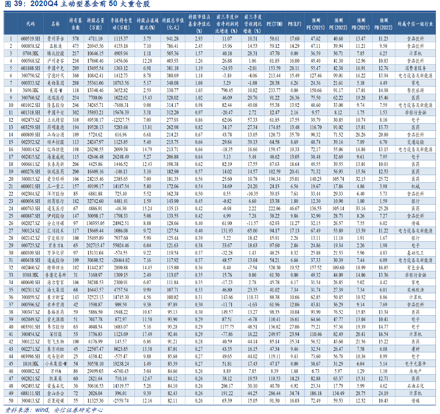 e公司讯,安信策略统计,在四季度机构集中持股背景下,2020第四季度白酒股依然是各大主动型基金的宠儿,贵州茅台和五粮液分别为第一、第二大重仓,持股市值占基金净值比分别达2.93%和2.45%,遥遥领先,紧随其后的还有泸州老窖、山西汾酒、洋河股份等二三线白酒股。同时,前二十大重仓中还有腾讯控股、中国中免、宁德时代、美的集团、美团-W、迈瑞医疗和隆基股份等龙头上市公司,以科技股和高端制造为主。