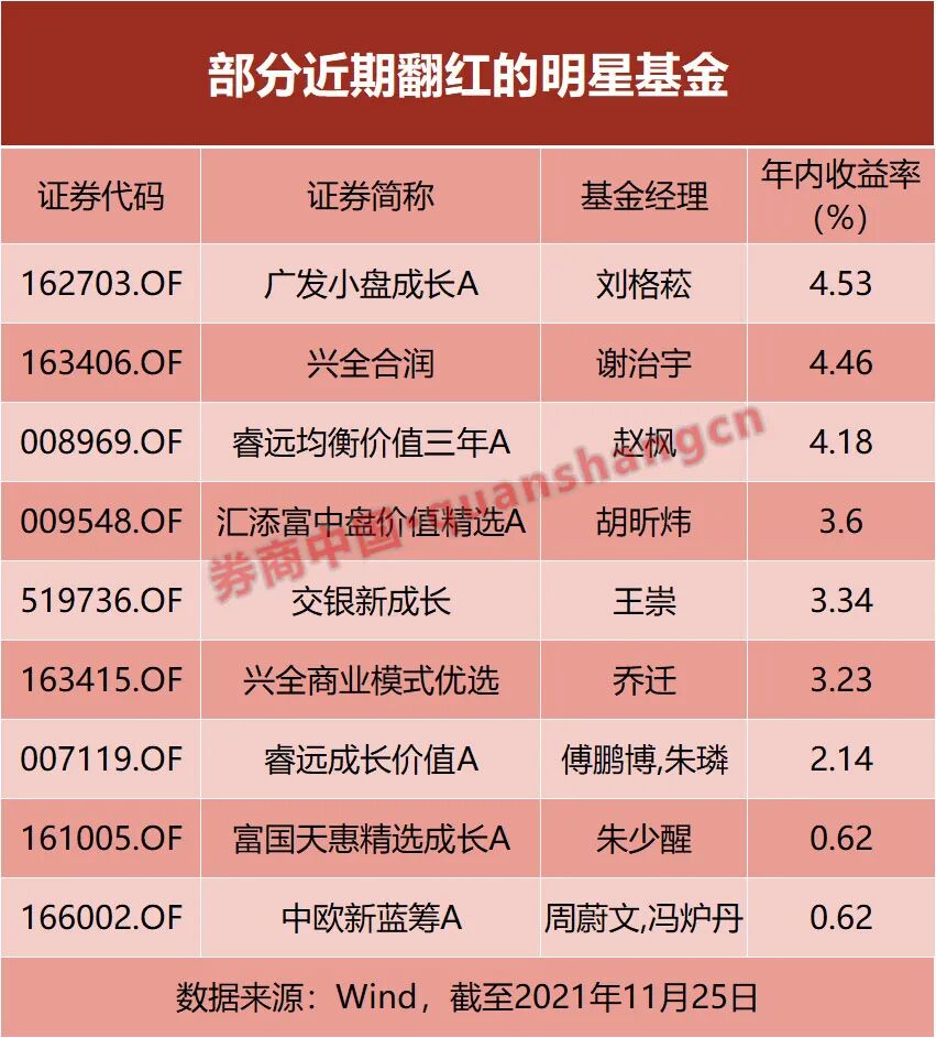 此外,朱少醒的富国天惠、周蔚文的中欧新蓝筹、王崇的交银新成长等明星基金也纷纷在近期实现了扭亏为盈,自年初以来的累计收益率分别为0.62%、0.62%、3.34%。