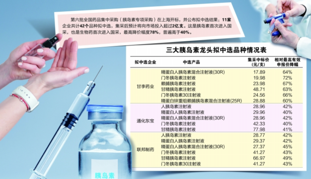 这是胰岛素首次进入国采,也是生物药首次进入国采,降价幅度普遍高于40%。拟中标企业包括亿帆医药(002019)、天麦生物、联邦制药(3933.HK)、通化东宝(600867)、万邦医药、东阳光药(1558.HK)、甘李药业(603087)、海正药业(600267)8家国内药企,以及诺和诺德、礼来、赛诺菲3家跨国药企。
