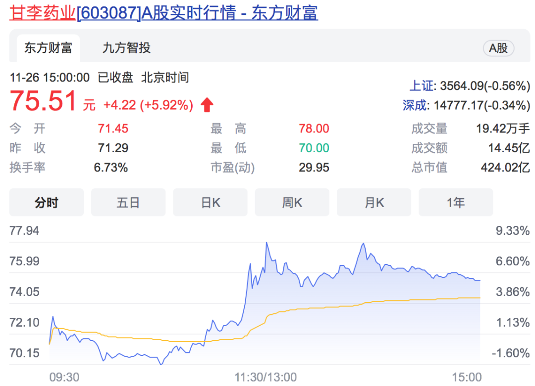 受此消息提振,甘李药业11月26日盘中股价一度冲击涨停,最终收涨5.92%。甘李药业是国内三代胰岛素龙头企业,一直专注于糖尿病领域,曾成功研制出首支中国自主研发的重组人胰岛素、长效及速效重组胰岛素类似物,并率先实现规模化生产。此次多款产品中标集采,业内人士表示并不意外。