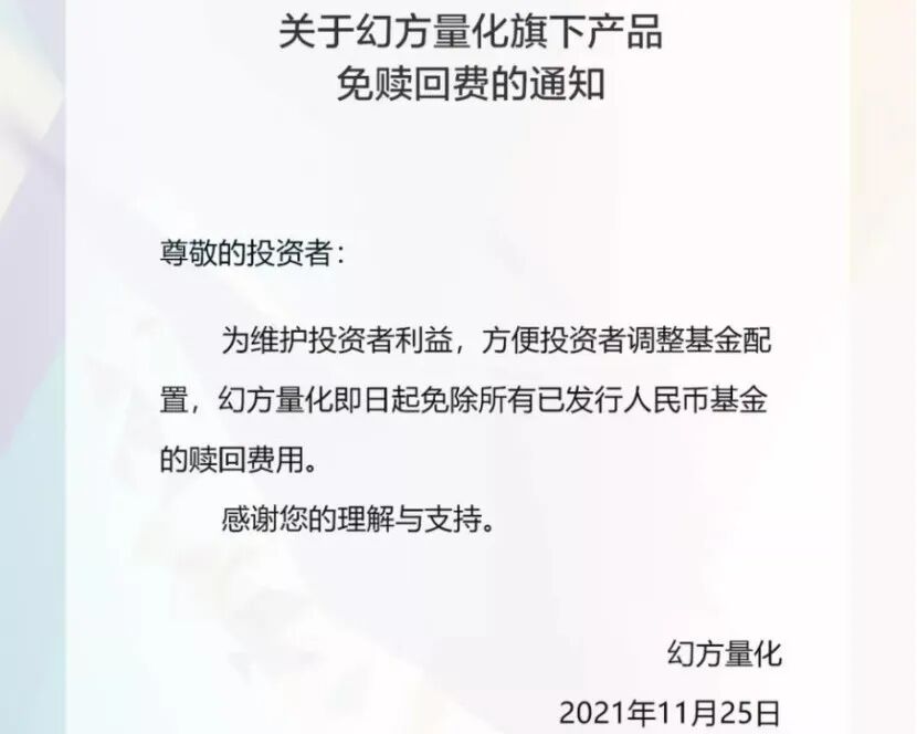 幻方量化25日在官微发布消息称,为维护投资者利益,方便投资者调配基金配置,公司即日起免除所有已发行人民币基金的赎回费用。
