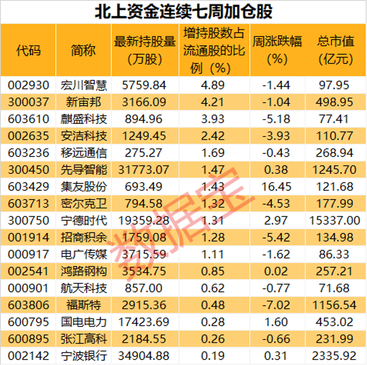 数据宝统计显示,北上资金连续7周买入17股,从增持股数占流通股的比例来看,宏川智慧获加仓幅度最大,较7周前持股比例增长4.89%;其他连续加仓的还有新宙邦、麒盛科技、安洁科技的持股比例增长2%以上。