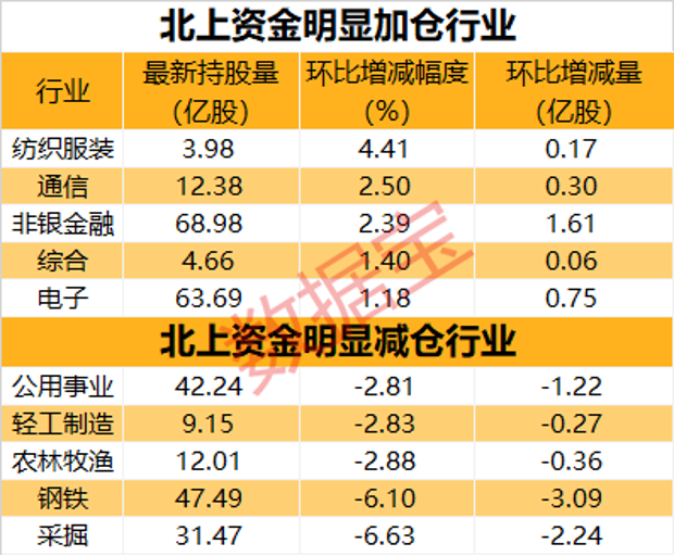 数据宝统计显示,本周北上资金持股量环比增加的行业仅8个,环比减少的行业共20个。纺织服装行业获北上资金青睐,环比增幅最大,北上资金最新持有该行业3.98亿股,相比上周末增长3.58%;环比增幅居前的还有通信、非银金融、综合等行业。从持股量增长净值来看,非银金融获北上资金本周净买入最多,共买入1.61亿股。