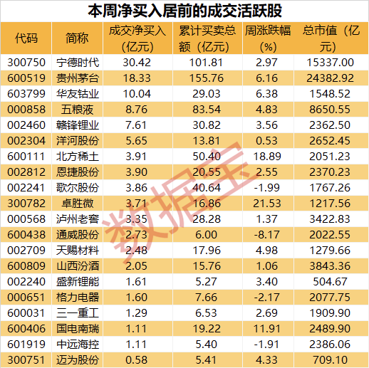 以净买卖金额统计,本周上榜的个股中,23只股为净买入,净买入金额最高的是宁德时代,本周净买入30.42亿元,其次是贵州茅台、华友钴业、五粮液,净买入金额分别为18.33亿元、10.04亿元、8.76亿元。净卖出个股中,净卖出金额最高的是伊利股份,本周净卖出18.16亿元。净买入居前个股中,贵州茅台、五粮液、洋河股份、泸州老窖等均为白酒股,北上资金开始回流。