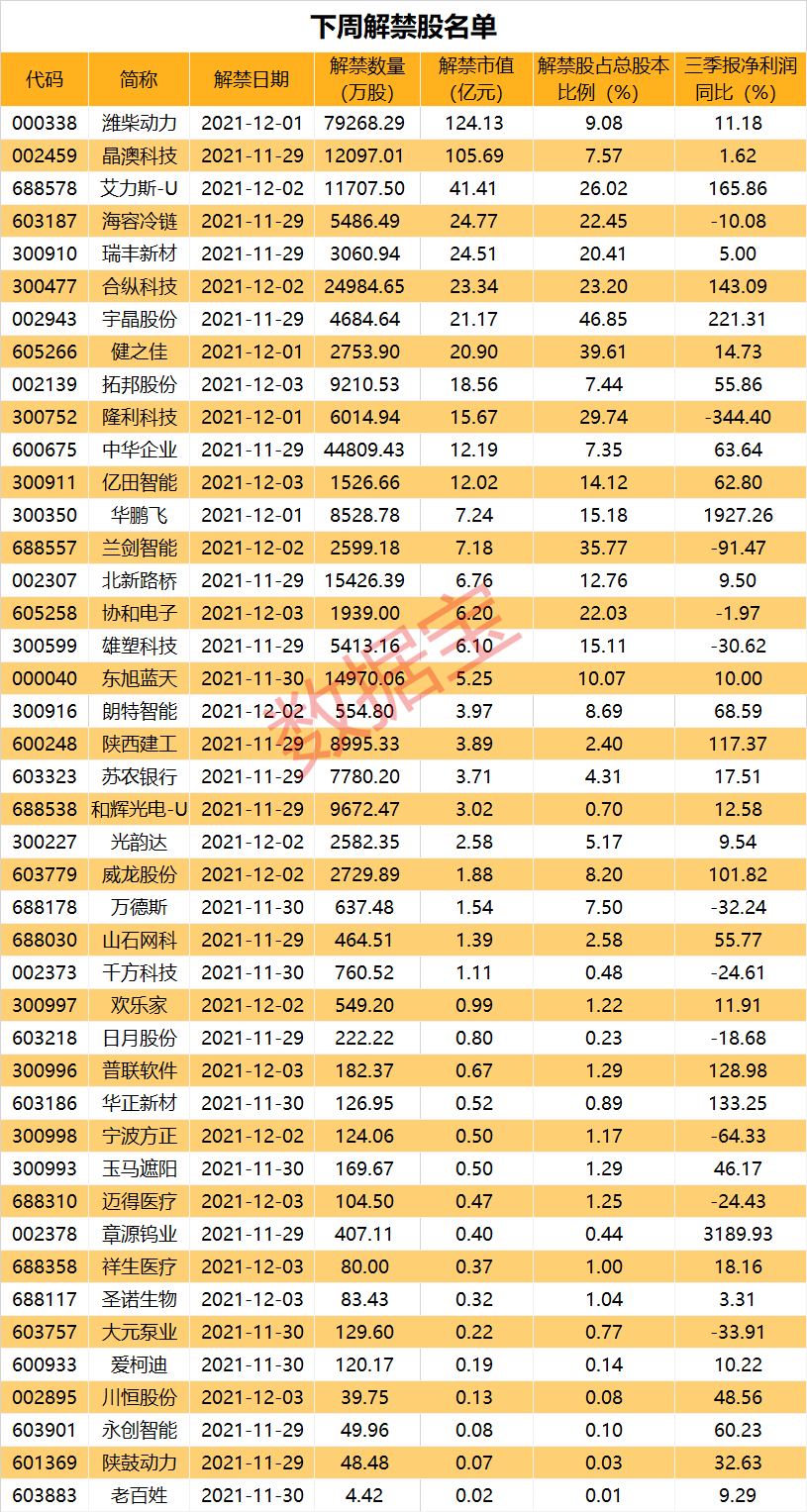 数据宝统计,解禁股数量占总股本比例不足1%的有11股;爱柯迪、永创智能、川恒股份、陕鼓动力、老百姓的解禁比例较小。