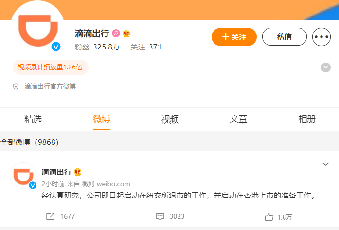 12月3日9点01分,滴滴出行在微博官宣:经认真研究,公司即日起启动在纽交所退市的工作,并启动在香港上市的准备工作。
