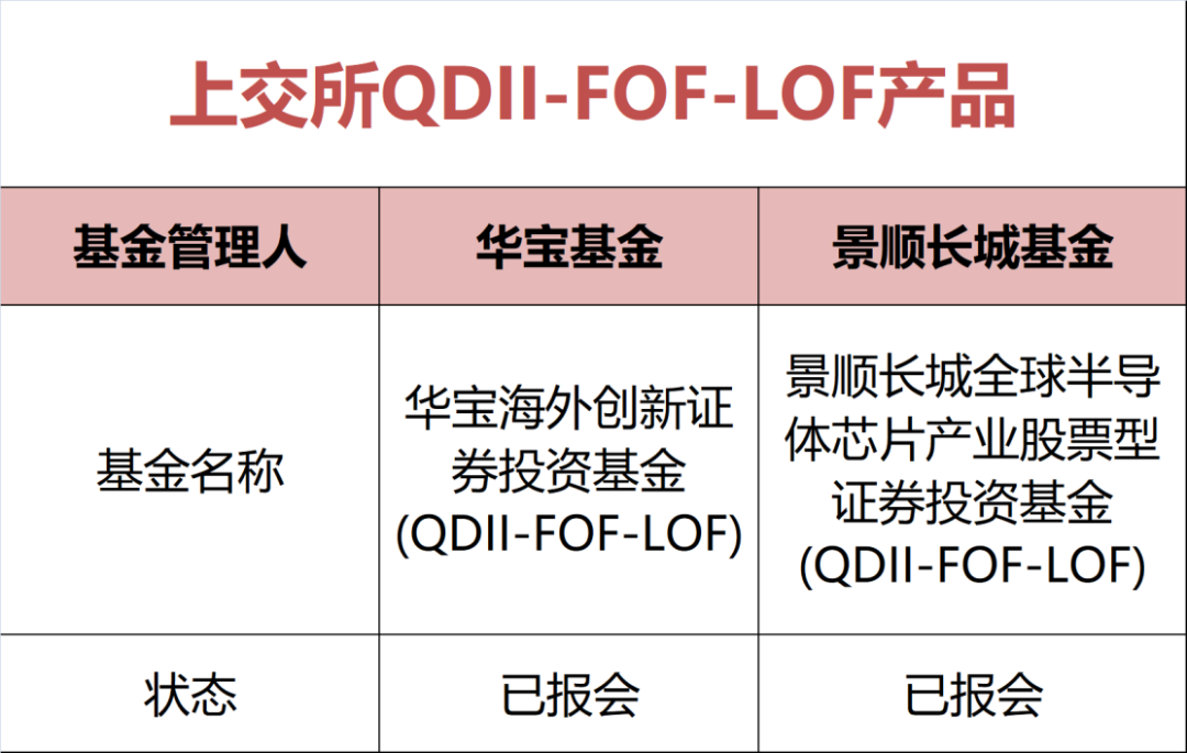 12月2日,证监会官网信息显示,景顺长城和华宝基金上报了首批QDII-FOF-LOF产品,产品名称分别为“景顺长城全球半导体芯片产业股票型证券投资基金(QDII-FOF-LOF)”、“华宝海外创新证券投资基金(QDII-FOF-LOF)”,将公募基金在FOF领域的创新再次推进一大步。