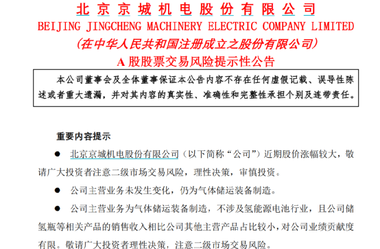 不过,对于股价的大涨,京城股份频发风险提示公告,并且澄清称公司并不涉及氢能源电池行业。