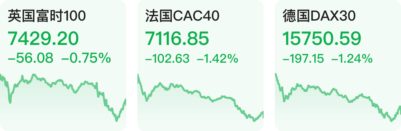 欧洲三大指数全部下跌。截至收盘,英国富时100指数跌0.75%,法国CAC40指数跌1.42%,德国DAX30指数跌1.24%。