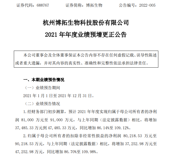 1月14日晚间博拓生物(688767)披露2021年业绩预告显示,经财务部门初步测算,预计期内实现净利润8.1亿元至9.1亿元,与上年同期相比,将增加3.75亿元到 4.75亿元,同比增加86.14%至109.12%;扣非净利润8.02亿元至9.02亿元,与上年同期(法定披露数据)相比,将增加3.73亿元至4.73亿元,同比增加86.7%至109.98%。