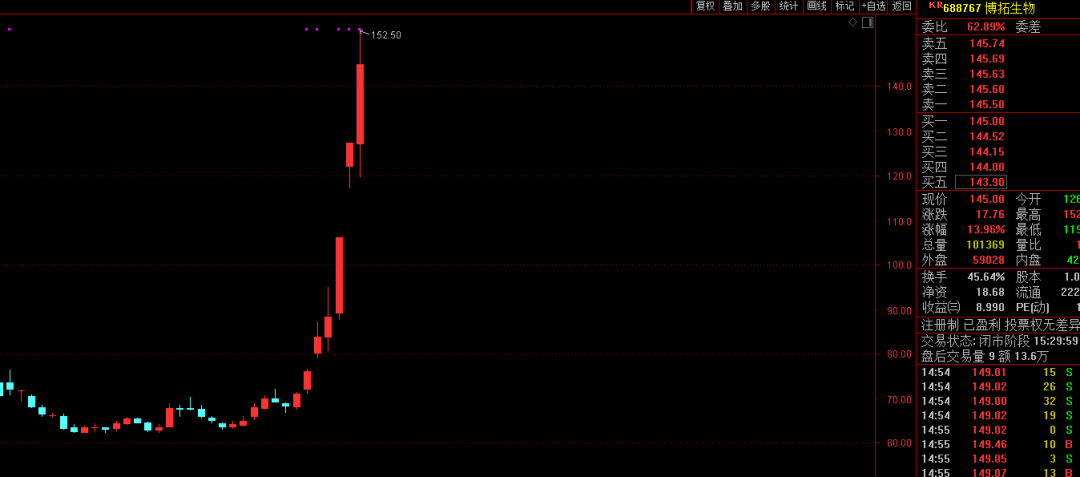 1月14日,博拓生物股价再度大幅飘红,当日最高报152.5元/股,收于145元/股,录得13.96%涨幅。而从1月6日以来,该股从最低67.36元/股起涨,短短7个交易日累计最大涨幅已超过126%。