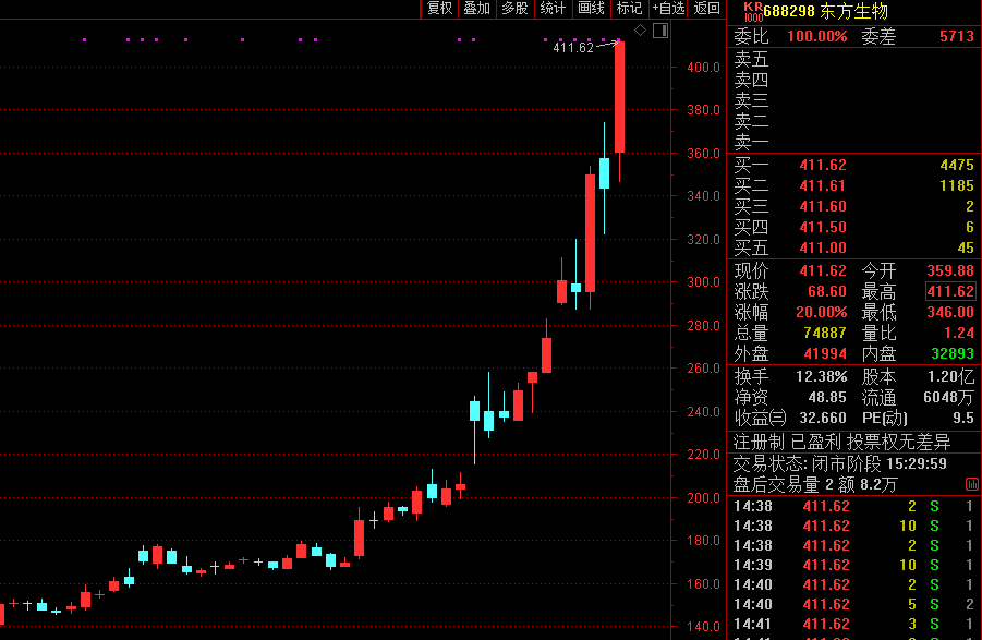 而东方生物14日报收涨停,单日涨幅20%,1月5日以来最大涨幅也超过了75%。