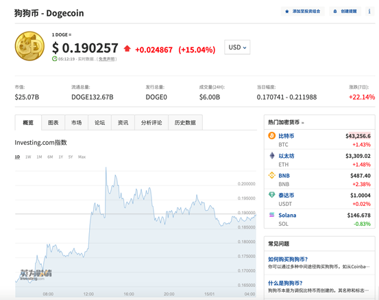 受此消息影响,狗狗币当日内短线上扬,日内涨幅扩大至20%,现涨超15%。
