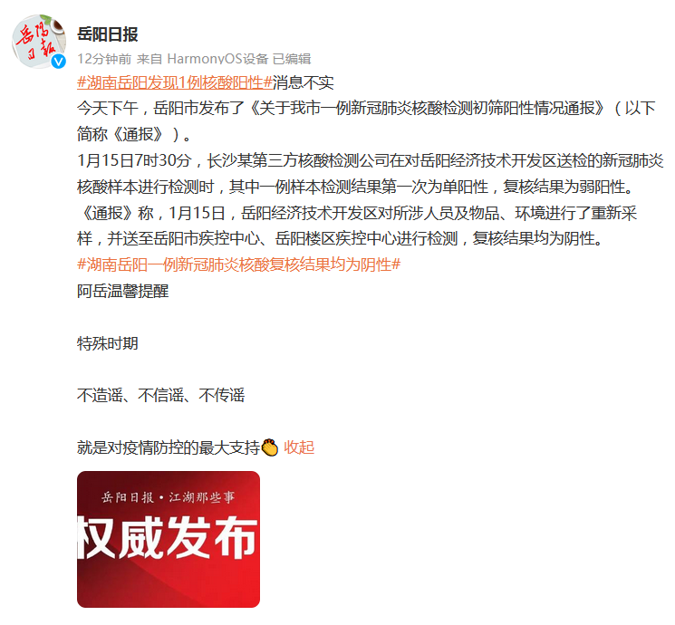 今天下午,岳阳市发布了《关于我市一例新冠肺炎核酸检测初筛阳性情况通报》(以下简称《通报》)。