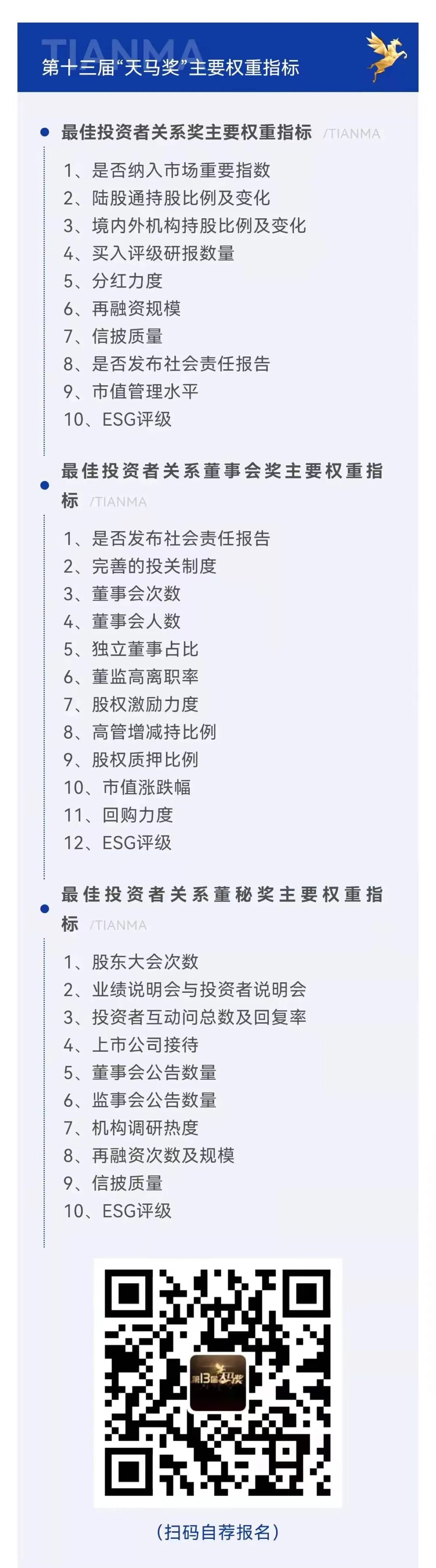 上市公司参与“天马奖”是对投资者关系管理能力的试炼和展示,荣获“天马奖”是对公司实力的嘉奖与表彰。目前报名通道已经打开,上市公司自荐正在火热进行,距离1月25日自荐环节截止仅剩下4天时间。自荐完成后,将陆续产生入围名单,进行公众网络投票,组织专家展开评审,提交监管部门复核,并在2022年4月初确定最终榜单。