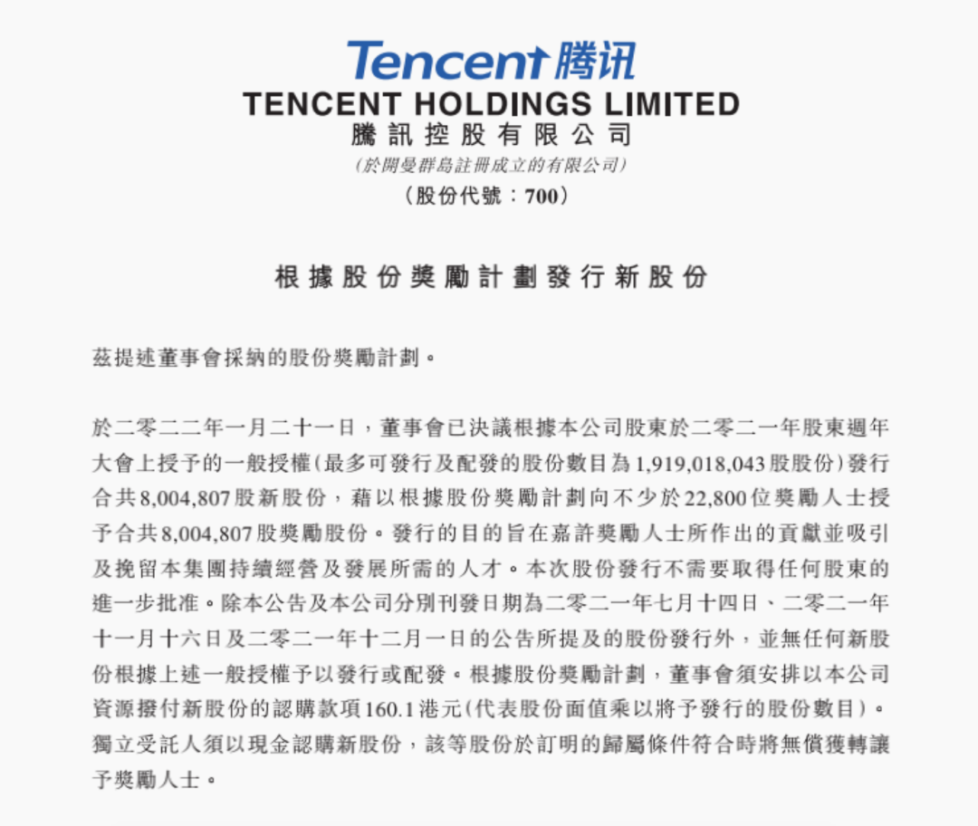 腾讯控股表示,发行的目的旨在嘉许奖励人士所作出的贡献并吸引及挽留本集团持续经营及发展所需的人才。“奖励人士将包括雇员、 行政人员或高级职员、董事、专家、顾问或代理。”