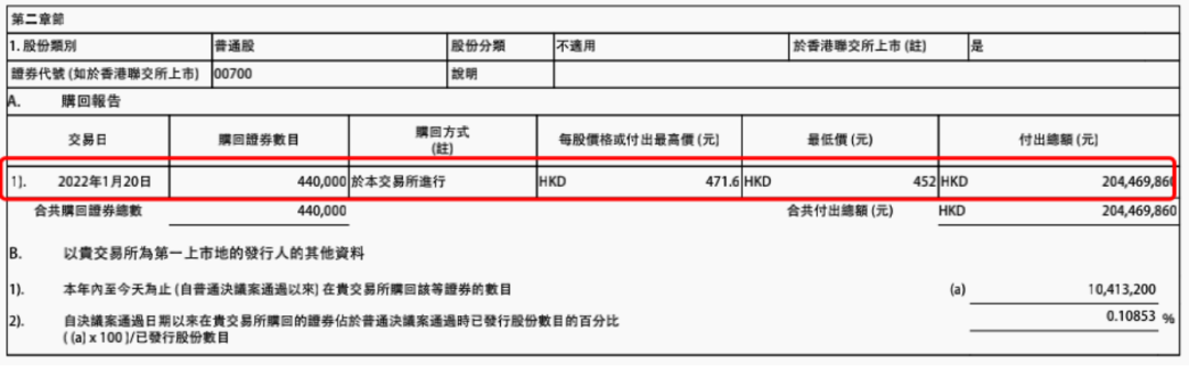 1月10日,腾讯斥资2.04亿港元回购45万股;