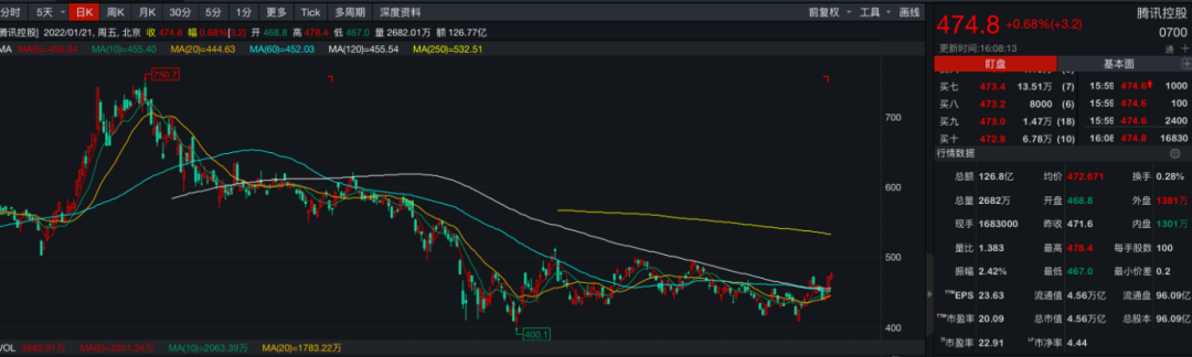 实际上,腾讯2021年整体的表现并不够好,进入2022年才略有好转,Wind数据显示,截至1月21日,腾讯收于474.8港元/股,上涨0.68%,过去一年来下跌达到25.11%,2022年以来,腾讯股价上涨约7.09%。