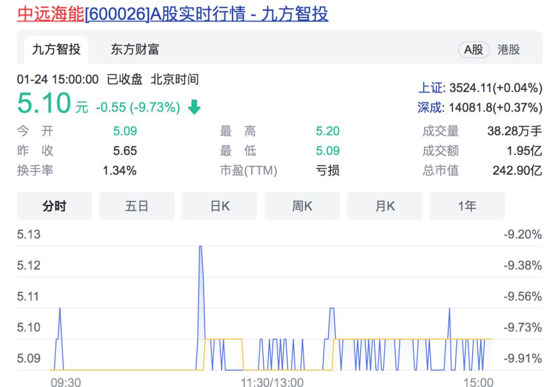 二级市场上,预亏后的首个交易日(1月24日),中远海能A股暴跌9.73%至5.1元/股。