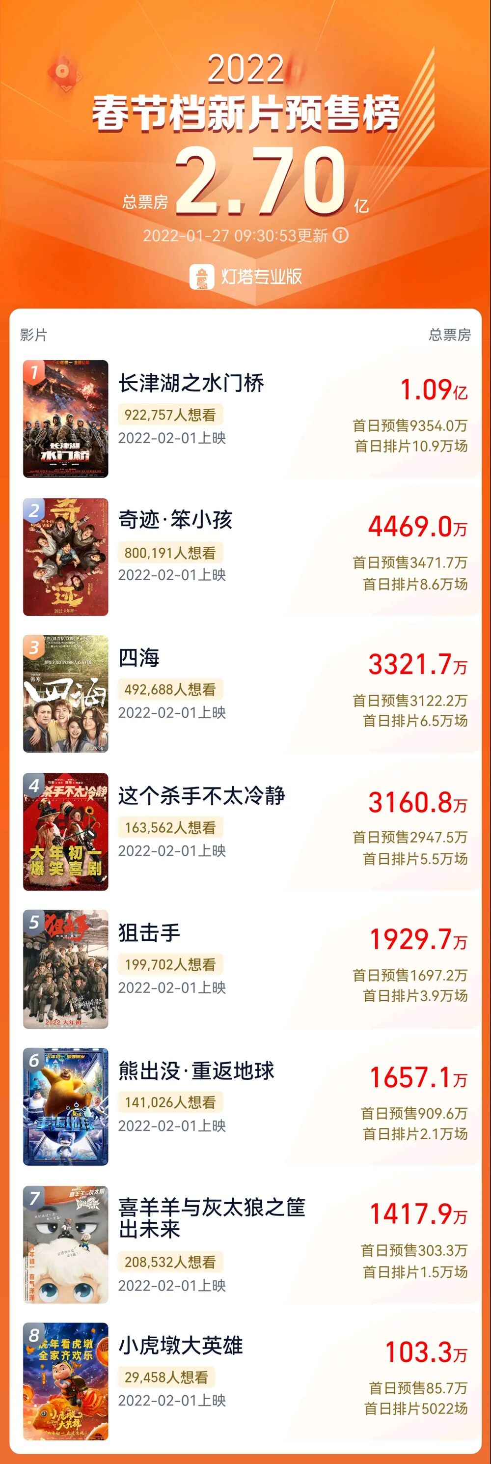 而截至1月27日9时30分,春节档票房预售突破2.7亿,大年初一当日的票房总额已经突破2亿元。