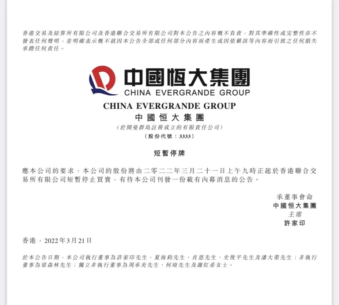 3月21日,中国恒大、恒大汽车、恒大物业三家港股恒大系公司在香港暂停交易。三家公司的公告显示,公司的股份将由2022年3月21日上午9时整起于香港联合交易所有限公司短暂停止买卖,有待公司刊发一份载有内幕消息的公告。