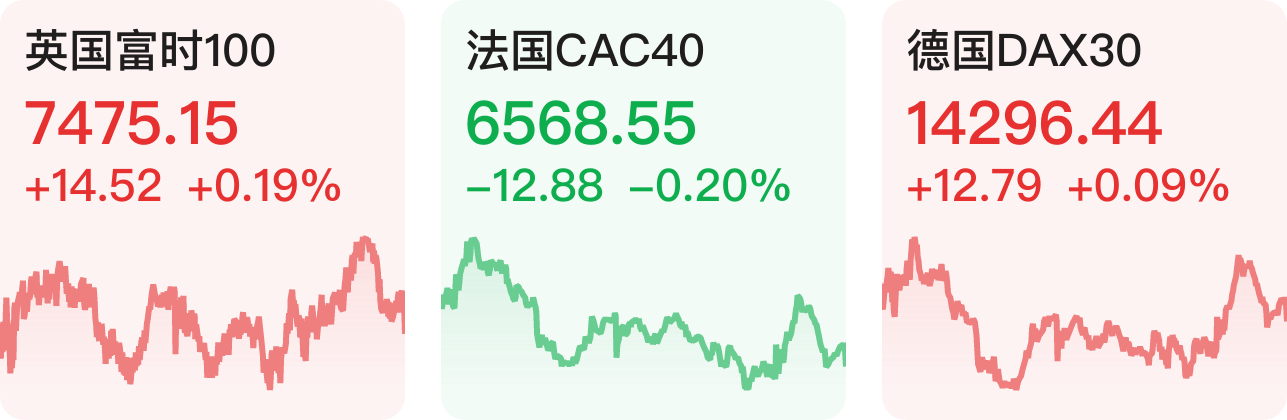 欧洲三大指数涨跌不一。截至收盘,英国富时100指数涨0.19%,法国CAC40指数跌0.2%,德国DAX30指数涨0.09%。