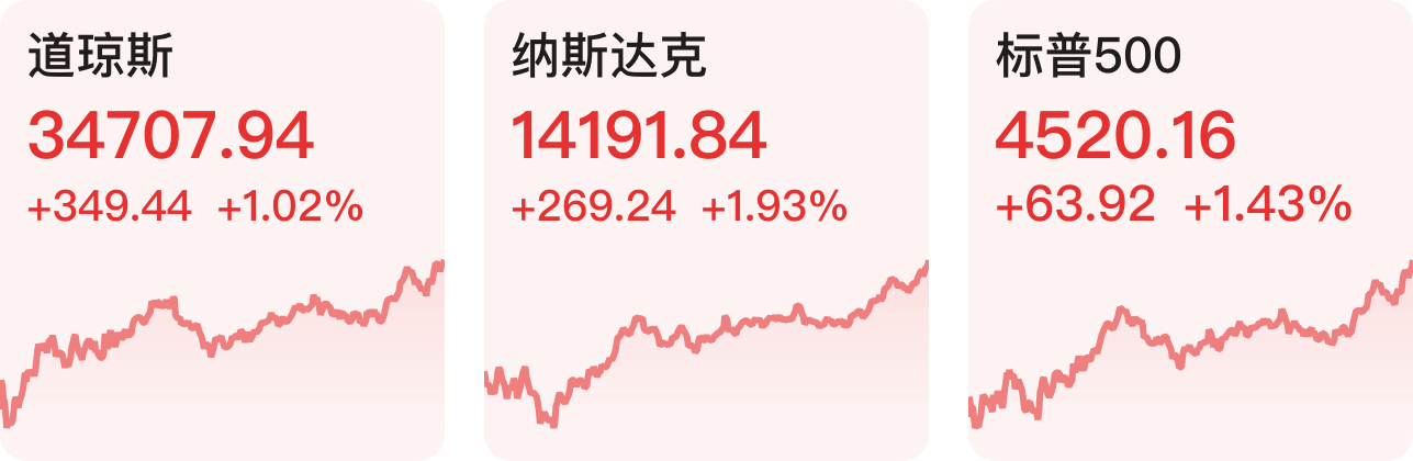 美股三大指数全线上涨。截至收盘,道琼斯指数涨1.02%,纳斯达克指数涨1.93%,标普500指数涨1.43%。芯片板块领涨,其中英伟达涨9.82%,创2021年11月份以来最大单日涨幅;英特尔涨6.94%。大型科技股涨跌不一,Meta涨近3%,谷歌、苹果涨超2%,特斯拉涨超1%。热门中概股涨跌不一, 拼多多跌超9%。