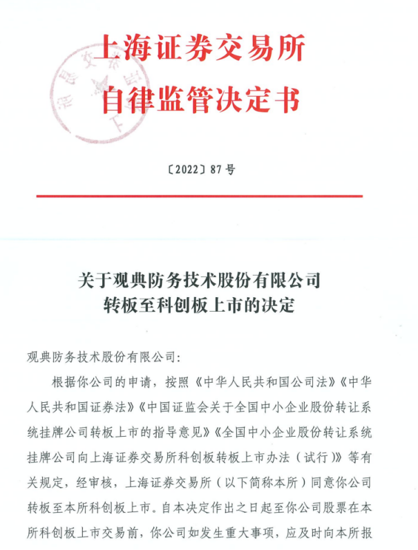 “1月27日观典防务已经通过科创板上市委的审核,这次上交所发布关于观典防务转板至科创板上市的决定,就相当于证监会的批文,接下来公司将进入发行程序。”一熟悉审核发行程序的业内人士告诉记者。