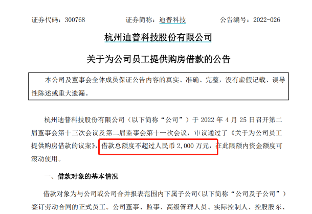 迪普科技于2022年4月25日召开了第二届董事会第十三次会议及第二届监事会第十一次会议,审议通过了《关于为公司员工提供购房借款的议案》。根据相关议案,公司给员工借款的总额度不超过2000万元,在此限额内资金额度可滚动使用。