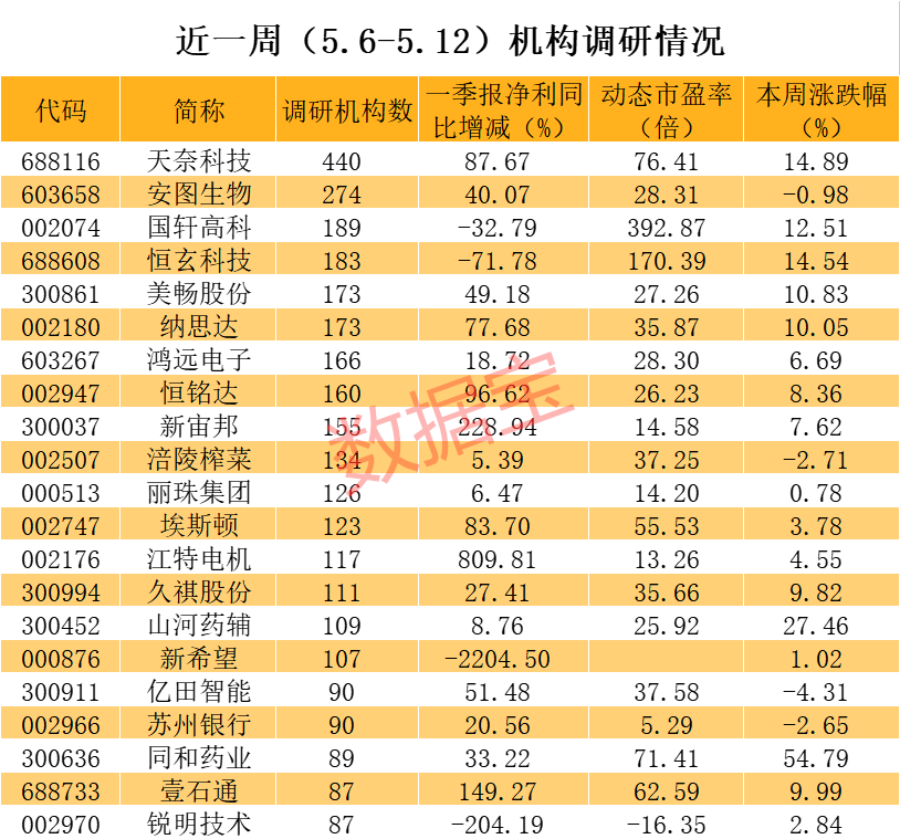近一周机构调研的上市公司中,远兴能源、云天化、长安汽车、晨光新材、万凯新材等10多只个股一季报净利同比增长超100%且动态市盈率低于10倍。其中,汉得信息和雅化集团净利增速均超过10倍。市盈率方面,明德生物、汉得信息、长安汽车等个股动态市盈率均不足6倍。