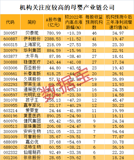 证券时报·数据宝统计,目前A股市场上布局母婴产业链的上市公司超百家,涵盖化妆品、乳制品、儿童药、玩具、零售、童装等多领域。根据5家以上机构一致预测,共有24家公司今后三年净利润增速均有望达到10%以上。平均增速最高的是安科生物,机构预测其今后三年净利润增速均值94.64%。