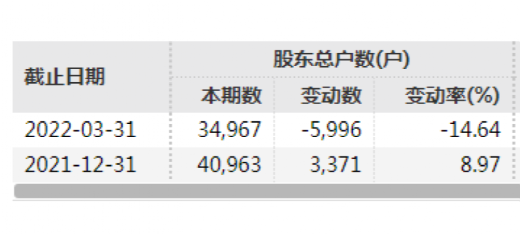 股东户数方面,截至2022年3月31日,会稽山股东总户数为34967户,相较于上期(2021年12月31日)减少了近6000户,同比降幅14.64%。