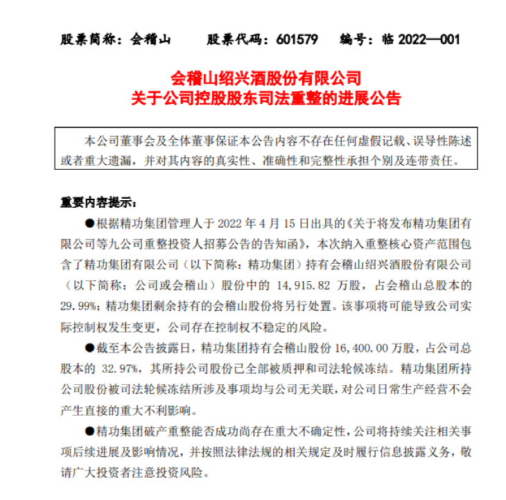 4月15日晚间,会稽山发布关于公司控股股东司法重整的进展公告称,公司控股股东精功集团管理人于4月15日出具《关于将发布精功集团有限公司等九公司重整投资人招募公告的告知函》,纳入重整核心资产范围包含了精功集团持有会稽山股份中的14915.82 万股,占会稽山总股本的 29.99%;精功集团剩余持有的会稽山股份将另行处置。