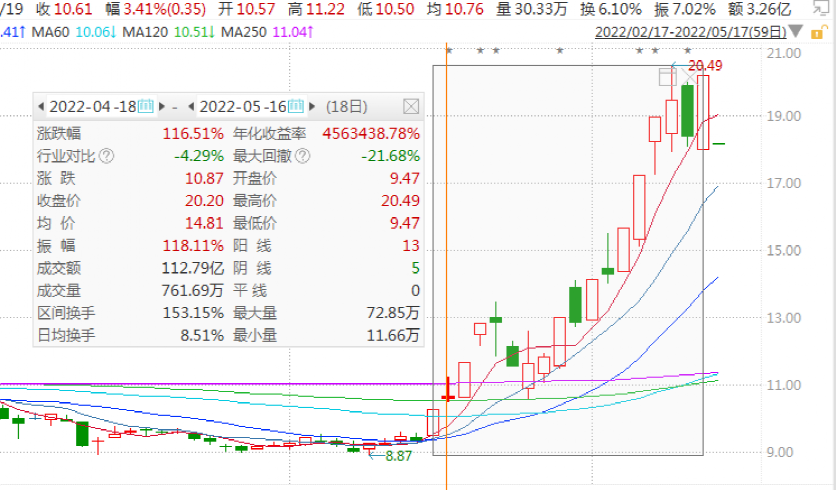自发布公告以来,4月16日至5月16日一个月内,18个交易日里会稽山实现13个收涨,并录得9个涨停板,区间涨幅达116.51%。其中5月16日,会稽山再次涨停收盘,股价上涨10.02%,收盘价为20.20元,相较于4月15日9.33元/股价已然翻倍,市值也突破百亿元。
