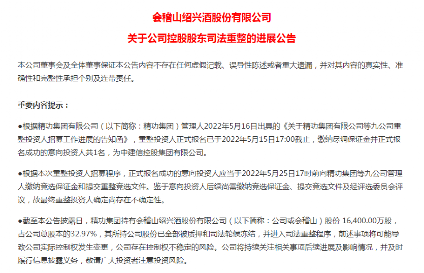 会稽山在公告里表示,根据精功集团管理人2022年5月16日出具的《关于精功集团有限公司等九公司重整投资人招募工作进展的告知函》,重整投资人正式报名已于2022年5月15日17:00截止,缴纳尽调保证金并正式报名成功的意向投资人共1名,为中建信控股集团有限公司。