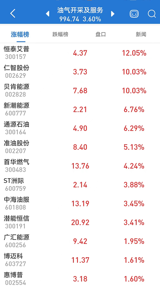 能源股早盘也集体活跃,石油板块放量跳空高开高走,板块指数涨逾1%,半日成交超昨日全天成交,恒泰艾普盘中一度冲击20%涨停,仁智股份、贝肯能源均直线秒涨停,三桶油集体飘红;可燃冰板块最高上涨逾3%,日K线连续第10日收阳,海默科技、通源石油等盘中均涨超10%;油气改革、页岩气等板块均创出近期新高,山东墨龙、大庆华科等涨停。