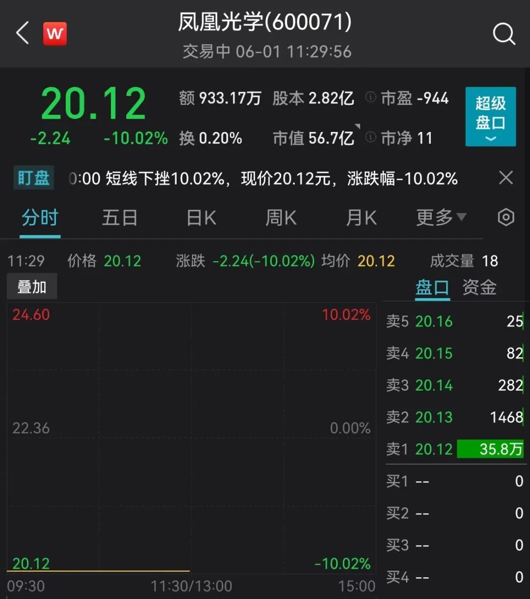 意料之中,6月1日早盘,凤凰光学再次一字跌停。